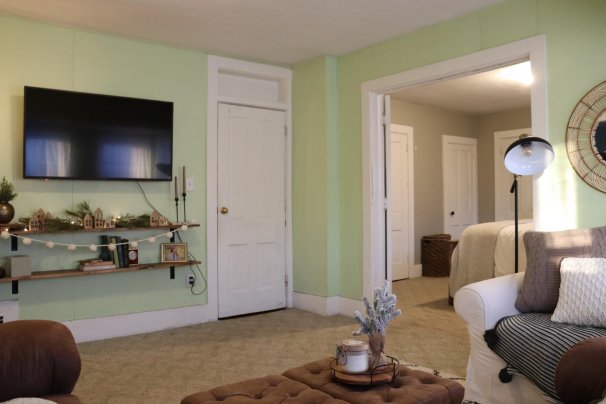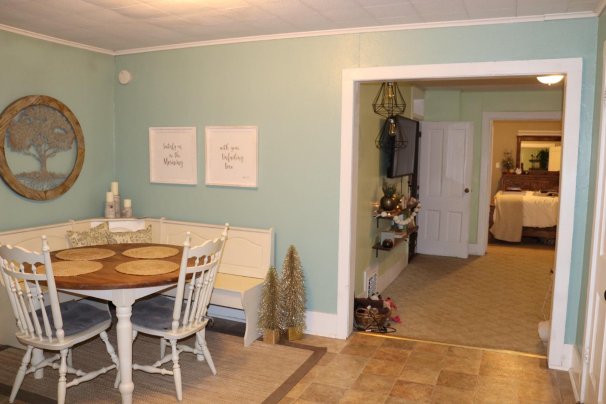 Big and bright 13x14 living room. Huge 12x13 dining room. Closed kitchenette with open-shelf storage wall. Queen 10x13 bedroom. Electric heat. Lower, upper front & upper back porches.