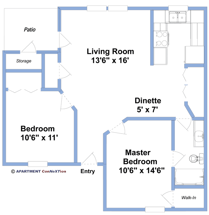 Large 15x14 living room with patio access. Efficient U kitchen loaded with cabinets. King 11x15 bedroom with walk-in closet. Queen 10x10. 2nd bedroom. Big easy-to-share bathroom with 5' vanity.