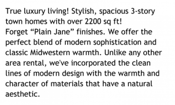 Forget “Plain Jane” finishes. We offer the perfect blend of modern sophistication and classic Midwestern warmth. Unlike any other area rental, we've incorporated the clean lines of modern design with the warmth and character of materials that have a natural aesthetic.