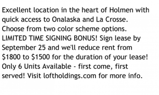 Three bedrooms, 2.5 baths, attached garages and private patio. Unique amenities include: - Keyless entry - Wood panel garage doors with windows - Wood look, rustic tile throughout first floor - Integrated surround sound - Recessed lighting and ceiling fans - Under cabinet and stairway lighting - Contemporary, patterned carpet - Quality, stylish finishes - Stainless steel appliances - Tons of storage. Excellent location in the heart of Holmen with quick access to Onalaska and La Crosse. Choose from two color scheme options. LIMITED TIME SIGNING BONUS! Sign lease by September 25 and we'll reduce rent from $1800 to $1500 for the duration of your lease! Only 6 Units Available - first come, first served! Visit loftholdings.com for more info.